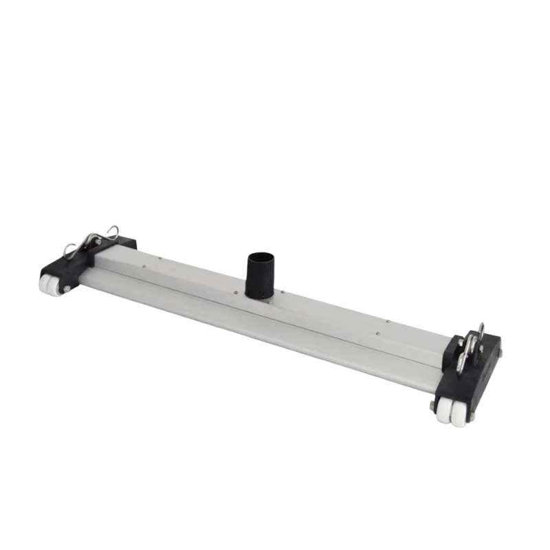 De aluminio con 4 ruedas dobles fijas y cepillos de polipropileno intercambiables, ancho de 82 cm y boca de aspiración de 2", ideado para piscinas de gran tamaño.