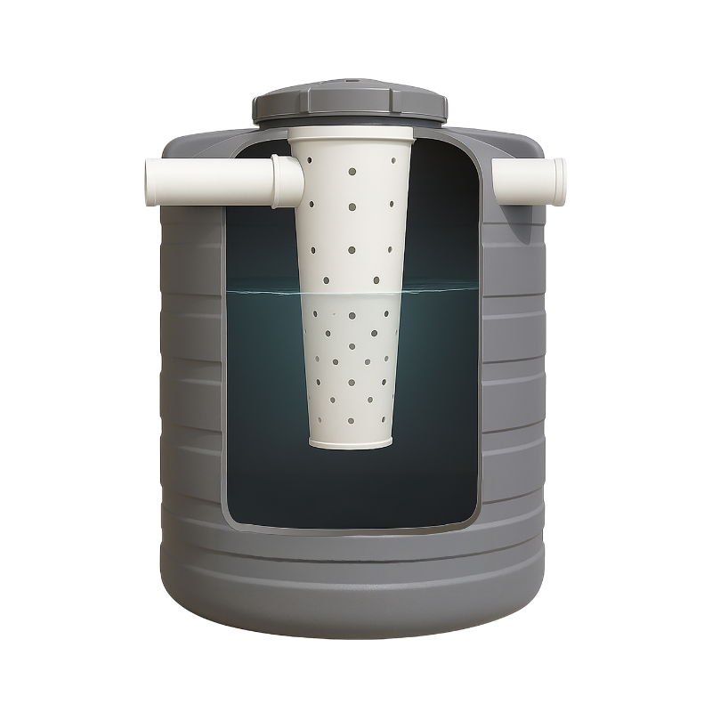 Botellón de 1.000 litros fabricado en polietileno, diseñado para el tratamiento anaeróbico de aguas residuales y residuos orgánicos.